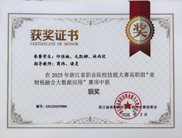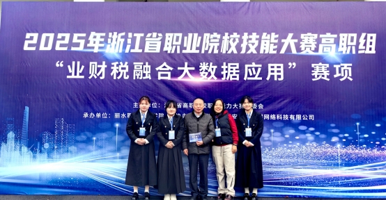 2025年浙江省职业院校技能大赛"业财税融合大数据应用"赛项于3月29日在丽水职业技术学院隆重举行,我校财务与会计学院代表队由丁增稳院长挂帅,商玮、诸灵担任指导老师,由印佳楠、毛凯娜(24大数据与财务管理五年一贯制2班)和林雨欣(23会计单考单招3班)组成的参赛选手代表队,以总分448.7的高分从全省31支劲旅中摘取第5名,首次荣获省级技能大赛银奖!这一历史性成绩,打破了财会学院沉寂多年的省级职业院校技能大赛无奖的局面,也是我校2025年浙江省职业院校技能大赛开门红,为学校其他各参赛队树立了一个榜样。