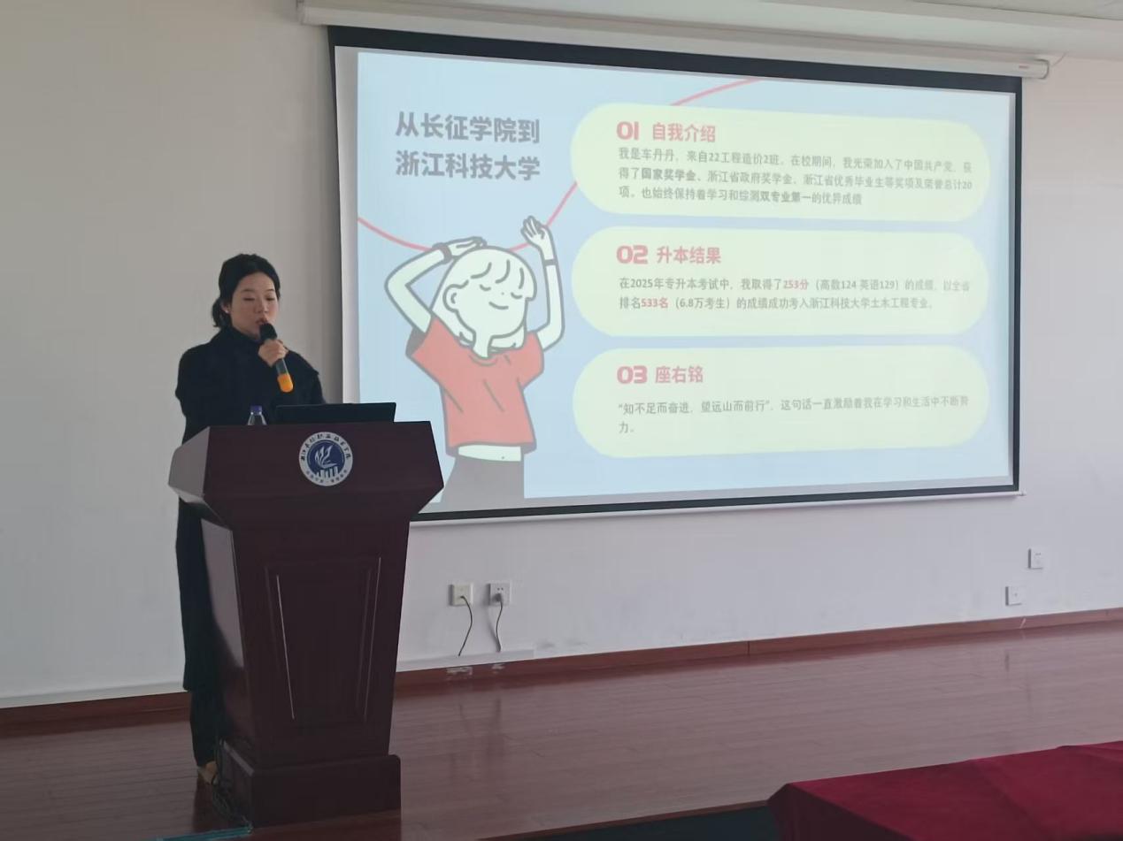 随后,车丹丹结合自身从本校升入浙江科技大学的备考经历,围绕专业基础积累、专升本决策依据、四轮复习战术、考场实战技巧等核心内容展开讲解,分享了知识图谱构建、错题银行建立、真题逆向分析等高效学习方法,还细致解读了目标院校选择、关键节点规划及突发状况应对策略。同时,她结合本科阶段的学习体验,介绍了资源平台利用与职业能力提升的路径,并通过经验传承、路线图示范等形式,为学弟学妹提供了可落地的行动指南。