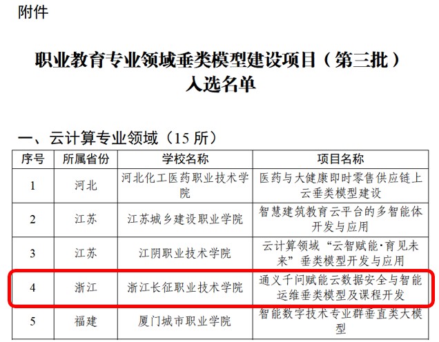 12月18日,教育部职业教育发展中心公布职业教育专业领域垂类模型建设项目(第三批)入选名单。其中,我院申报的“通义千问赋能云数据安全与智能运维垂类模型及课程开发”入选云计算专业领域项目。