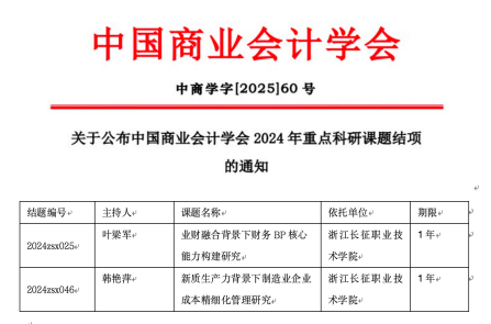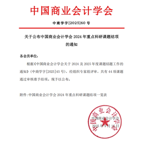 近日,接到中国商业会计学会《关于公布中国商业会计学会2024年重点科研课题结项的通知》,我院叶梁军老师主持的《业财融合背景下财务BP核心能力构建研究》、韩艳萍老师主持的《新质生产力背景下制造业企业成本精细化管理研究》两项重点科研课题,经过1年研究时间,完成了研究报告、论文发表、政策建议等相关内容,顺利通过专家评审验收,正式完成结项。