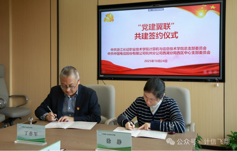10月24日,计算机与信息技术学院党总支与中国电信股份有限公司杭州分公司西湖分局西区中心支部在学校第二会议室举行“党建翼联”联建共建签约仪式。双方通过支部共建,实现资源共享、优势互补,共同提升党建工作水平,探索校企协同育人新路径。