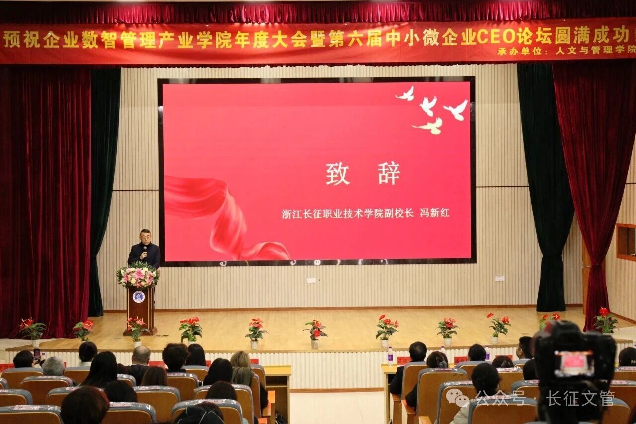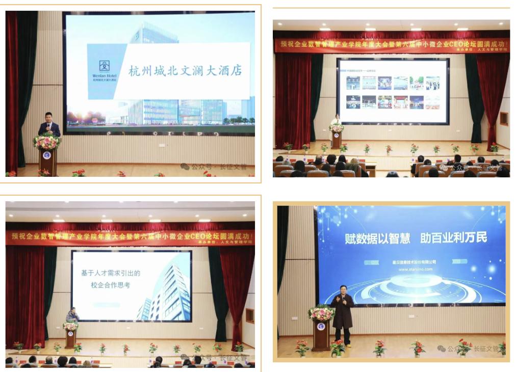 数智引领发展,校企协同育人。为进一步深化产教融合,打通教育、人才、产业与创新的链接,人文与管理学院于12月24日在校第二报告厅举办了“企业数智管理产业学院年度大会暨第六届中小微企业CEO论坛”。本次活动共有25家企业的26位企业家及高管出席了本次大会。人文与管理学院全体教师以及来自各个专业的学生共200余人参加了本次大会。