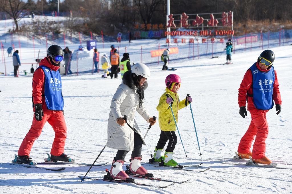 12月3日,在长春市天定山滑雪场,学生和家长在教练的指导下练习滑雪。新华社记者 张楠 摄