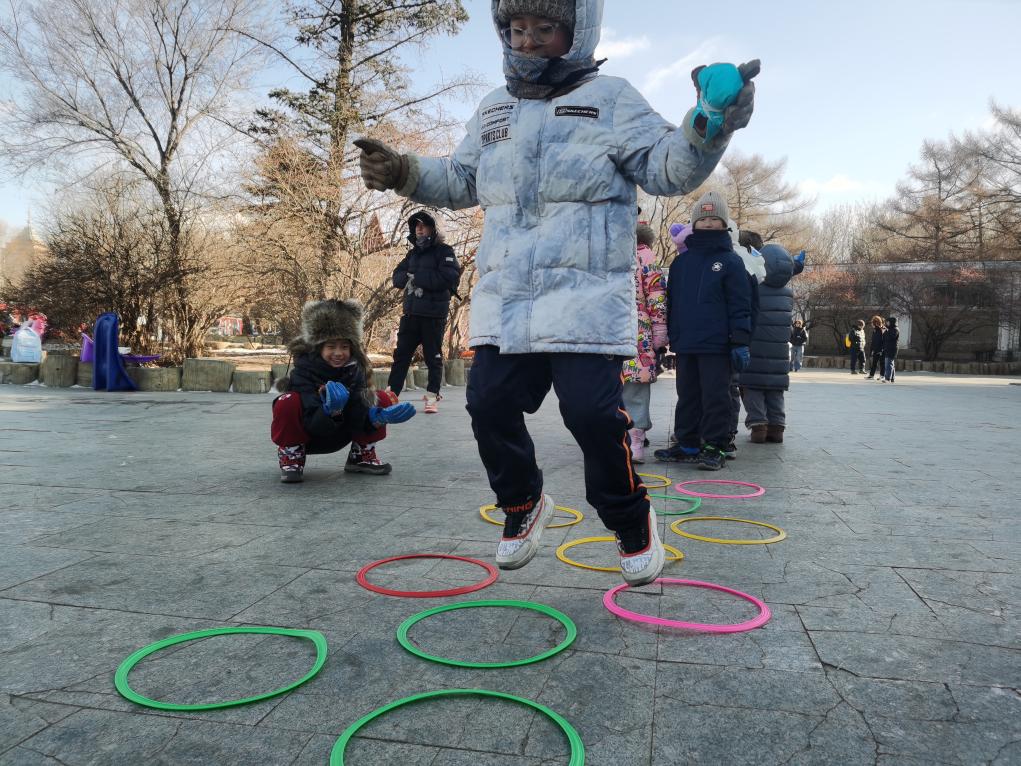 12月3日,吉林省第二实验学校的学生在南湖公园开展“亲近自然银冬初体验”主题活动,体验冰雪跳圈游戏。新华社记者 李典 摄