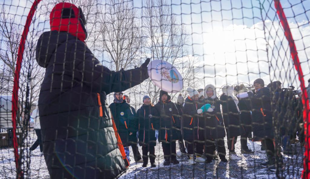12月3日,吉林市第一实验小学学生在吉林市纳美山谷度假区体验雪地飞盘。新华社记者 颜麟蕴 摄