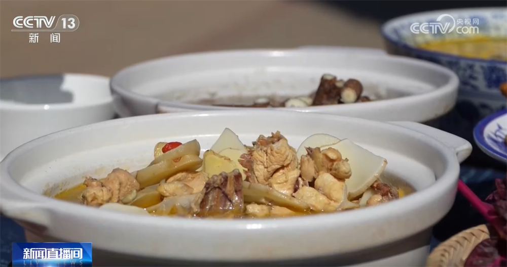 除了涨知识,来到百草村,地道美食可不容错过,这个是黄精炖鸡,这是当归羊肉,咱们也来尝一口。没有羊肉的膻味,只有醇厚的香甜。亲手制作专属纪念品也成为亲子互动、学生研学的热门环节,大家可以制作自己的专属香囊,设计创作像素版草药花等装饰周边,模样别致,不管是自留还是送人都很有纪念价值。