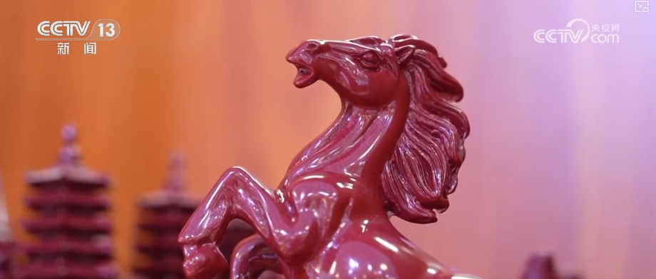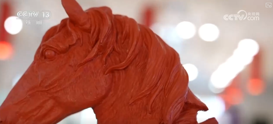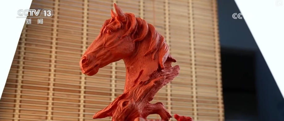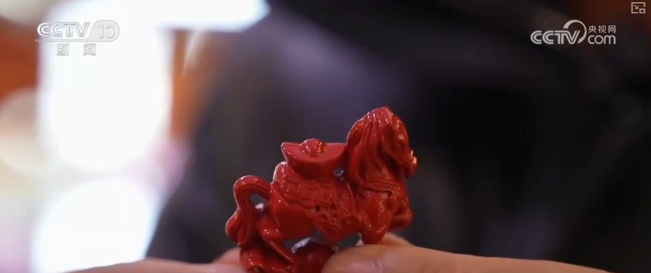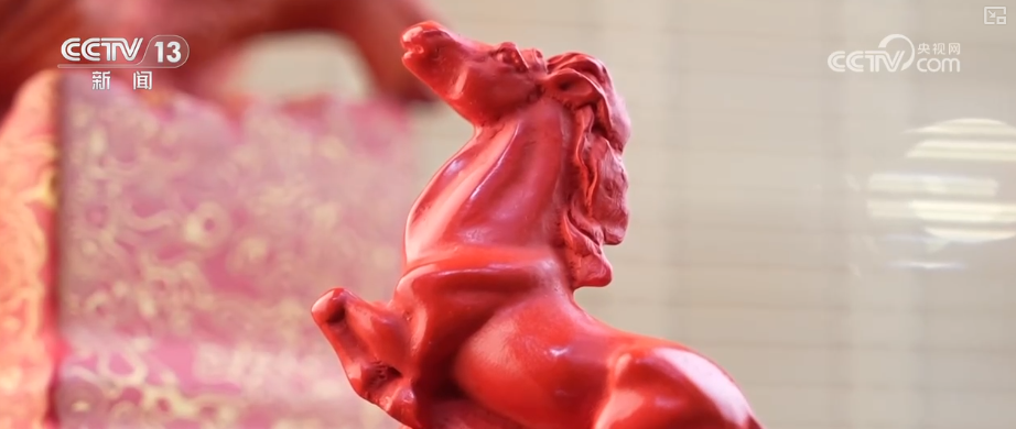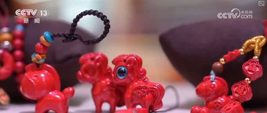 这匹鲜红的小马栩栩如生、活灵活现,它的毛发和肌理可以说是纤毫毕现,这件名为“马到成功”的工艺品是用朱砂制成的。随着新年临近,像这样的马元素朱砂工艺品销量暴增。
