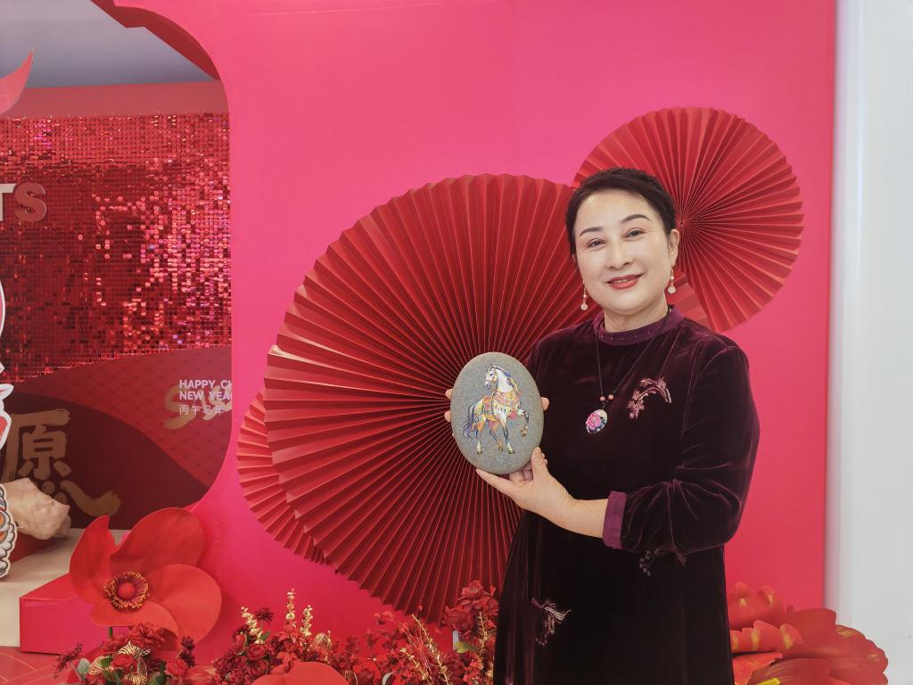 非遗代表性传承人宋笑珍展示创作的马年黄河石画。新华社记者艾福梅 摄