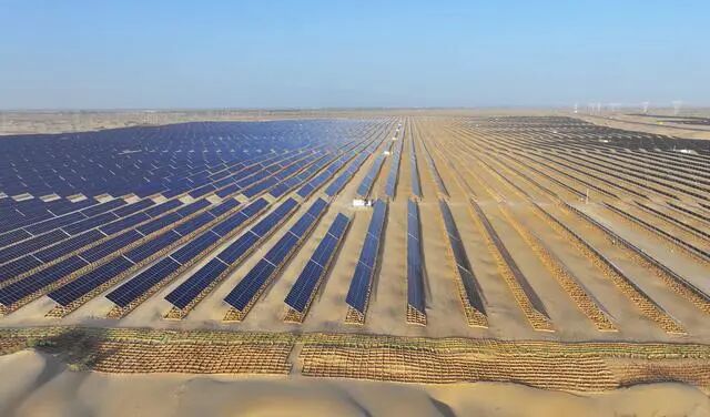 经过十余载不懈奋斗,光伏治沙项目在磴口、库布其、共和、南疆沙漠边缘等地区得到了成功探索,部分区域植被覆盖率从不足15%跃升至65%以上,有效遏制了沙化土地扩展势头,减少了风沙灾害对周边地区的影响,其中库布其沙漠“光伏长城”治沙带已建成装机规模1284万千瓦,治理沙地80万亩。如今,在我国广袤的沙戈荒地区,光伏治沙在推动荒漠土地高效利用、开发清洁能源的同时筑就了绿色生态屏障,创造了“沙海变蓝海、荒漠生金辉”的生态能源奇迹。光伏治沙书写了生态治理与新能源产业双向奔赴的生动实践,不仅为我国荒漠化治理提供了创新路径,更为全球生态治理和新能源发展贡献了中国智慧和中国方案。